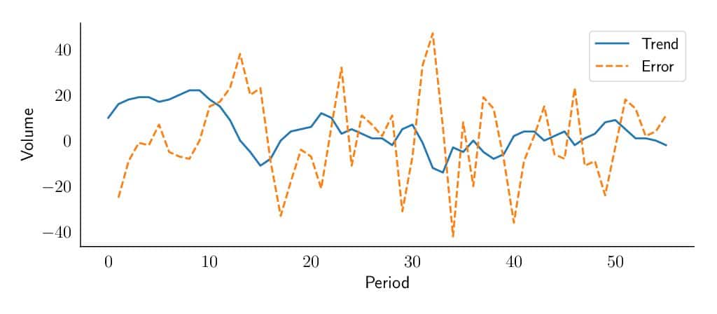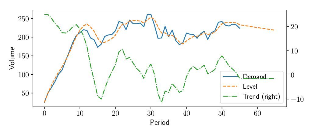 We define the trend as the average variation of the time series level between two consecutive periods. In our November 2018 blog, the level is the average value around which the demand varies over time. So, for example, if you had a sales level last week of 10 pieces, and this week the sales level is around 20 pieces, this means that you have a positive trend of 10 pieces per week.