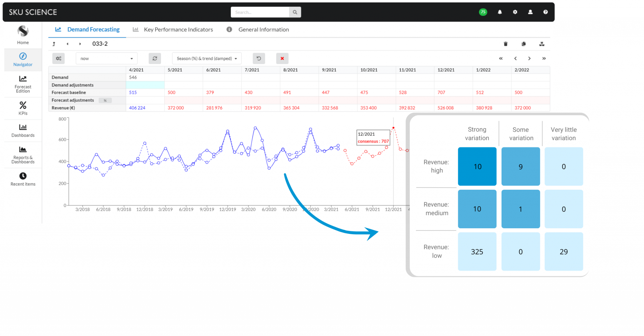 Modify the baseline forecasts or upload an external forecast from the sales team or any other source; we track your forecast value added against the SKU Science baseline.